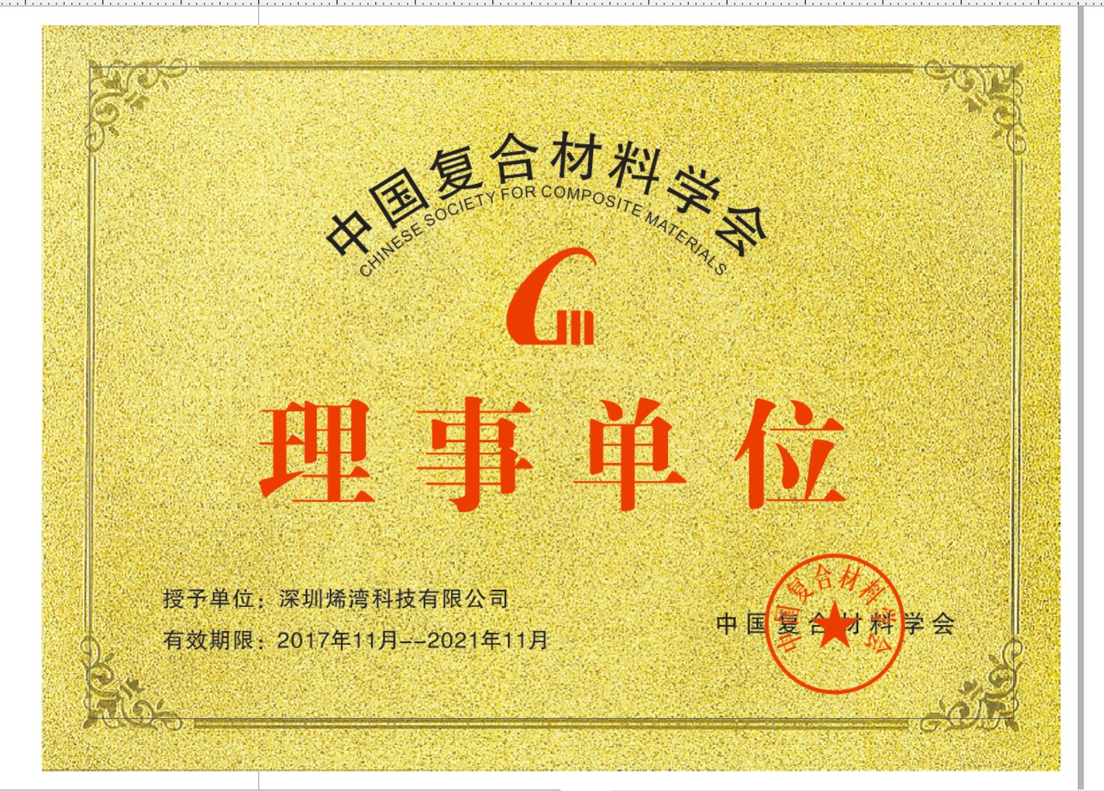 2017年11月,深圳烯灣科技順利通過資格審查,正式加入中國復(fù)合材料學(xué)會,并成為學(xué)會的理事單位。中國復(fù)合材料學(xué)會是中國國際復(fù)合材料科技大會(CCCM)的創(chuàng)建者,是國內(nèi)復(fù)合材料領(lǐng)域最大的學(xué)術(shù)交流與行業(yè)合作的平臺。加入學(xué)會后,烯灣科技將借助平臺優(yōu)勢資源,積極與國內(nèi)外相關(guān)領(lǐng)域從業(yè)人員交流與合作,在這個國際大舞臺上展現(xiàn)烯灣人的風(fēng)采。